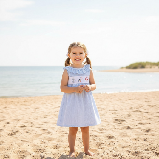Abby & Evie - Blue Nautical Trio Embroidery Ruffle Dress