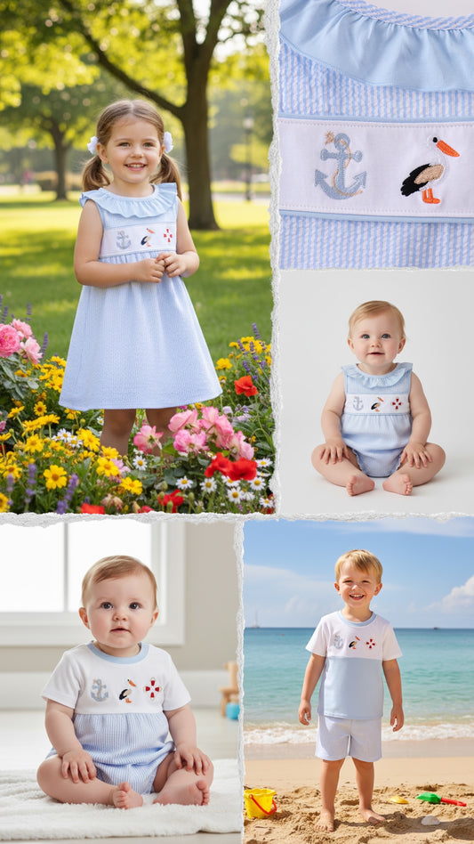Abby & Evie - Blue Nautical Trio Embroidery Seersucker Bubble