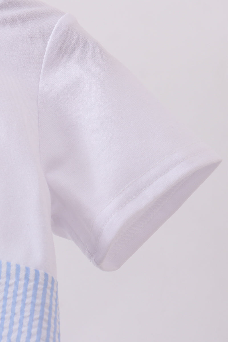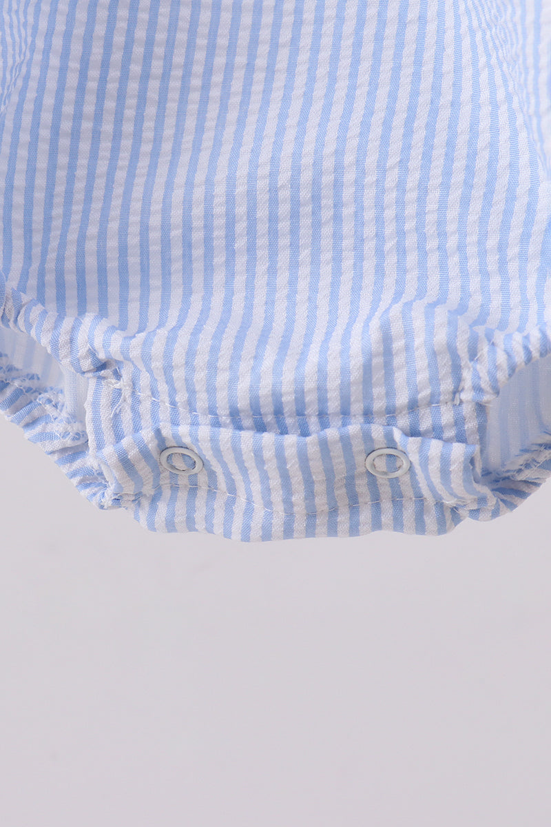 Dive into summer style with this charming seersucker bubble featuring a playful nautical trio embroidery design. The classic blue palette and textured seersucker fabric create the perfect lightweight piece for warm weather adventures. With its whimsical embroidered details and comfortable bubble silhouette, this little number brings coastal charm and carefree fun to any wardrobe. Ideal for beach days, casual outings, or making a splash at summer gatherings!
