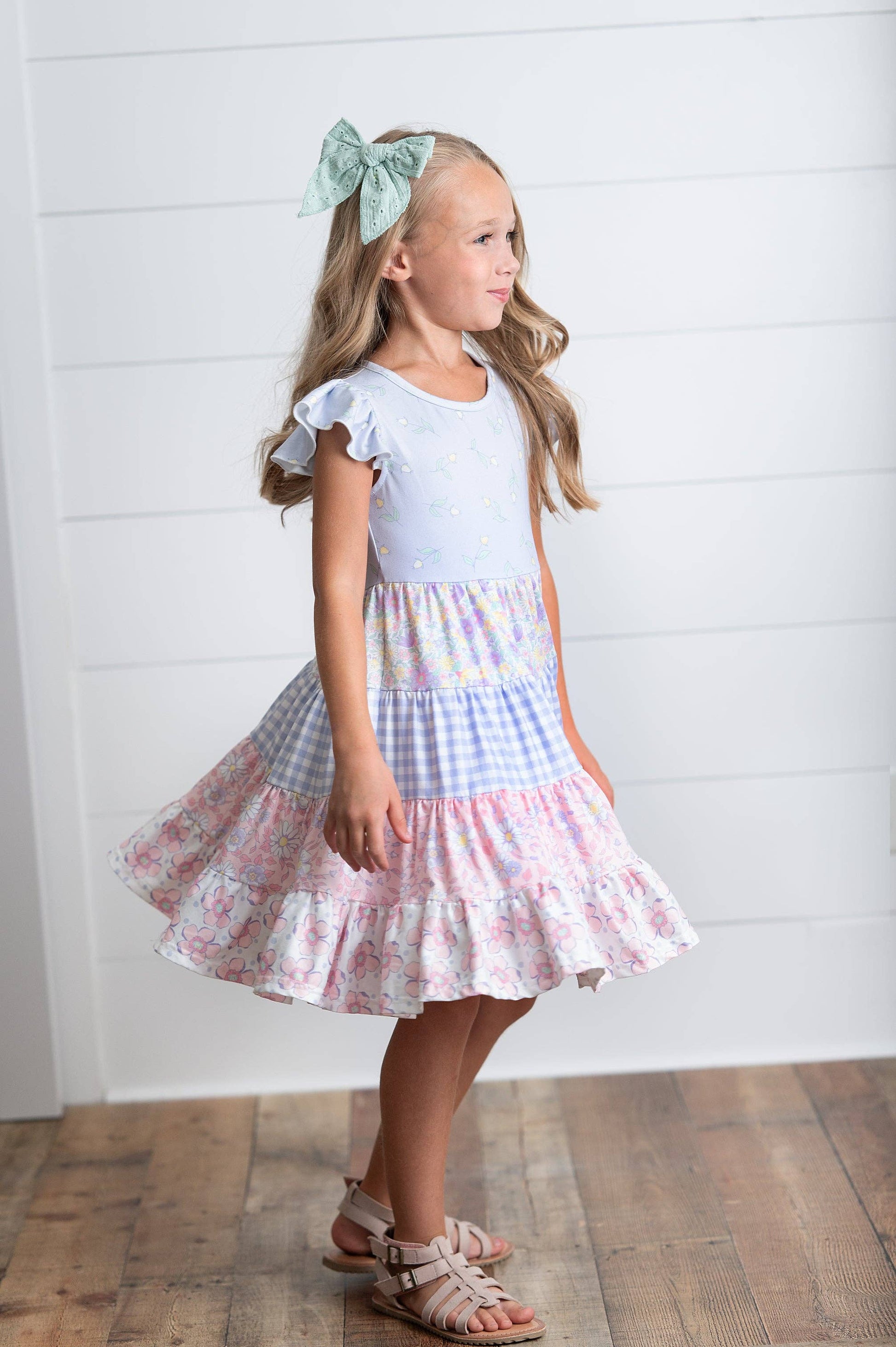 Adorable Sweetness - Girls Ava Twirl Lavender Floral Check Spring Tiered Dress