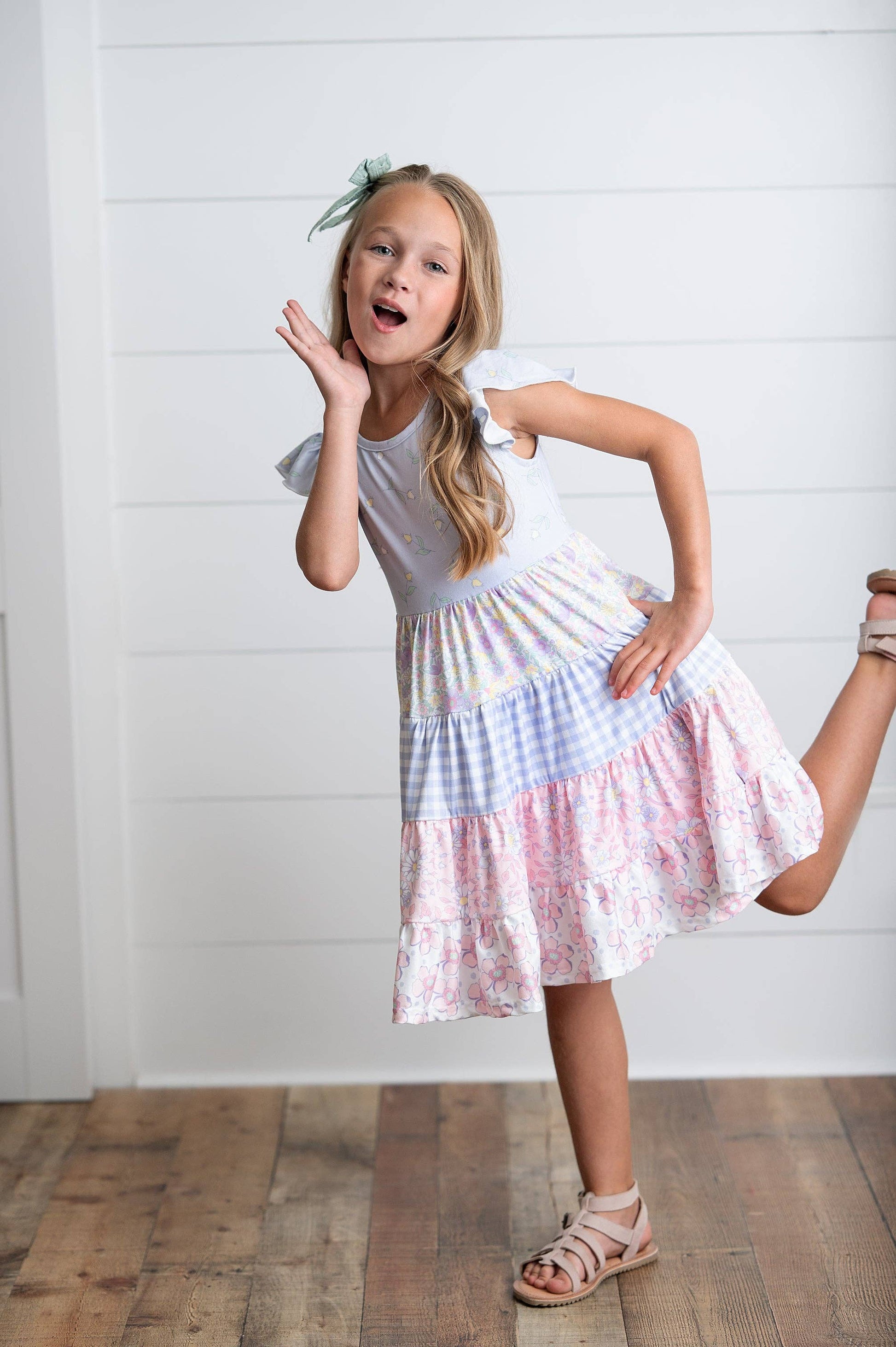 Twirl into magic with this enchanting Girls Ava Twirl Lavender Floral Check Spring Tiered Dress! Featuring delicate tiered layers that dance with every spin, Ava's dreamy design captures pure joy. The soft, flowing fabric moves beautifully, making playtime feel like a fairytale adventure. Perfect for twirling, twisting, and creating unforgettable moments. Watch her confidence bloom in this whimsical favorite!