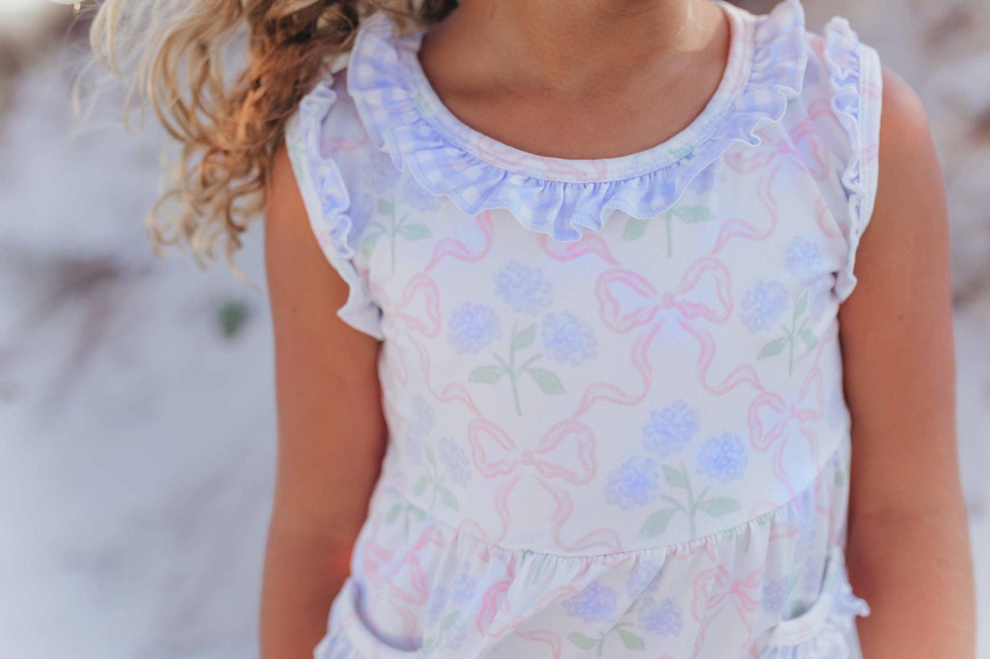 Stay cute and comfy in our Lavender Check & Bow Short Set! This girls' set includes a checkered tunic top with pocket and ruffle details, paired with matching gingham shorts. Perfect for spring and summer, and even Easter!