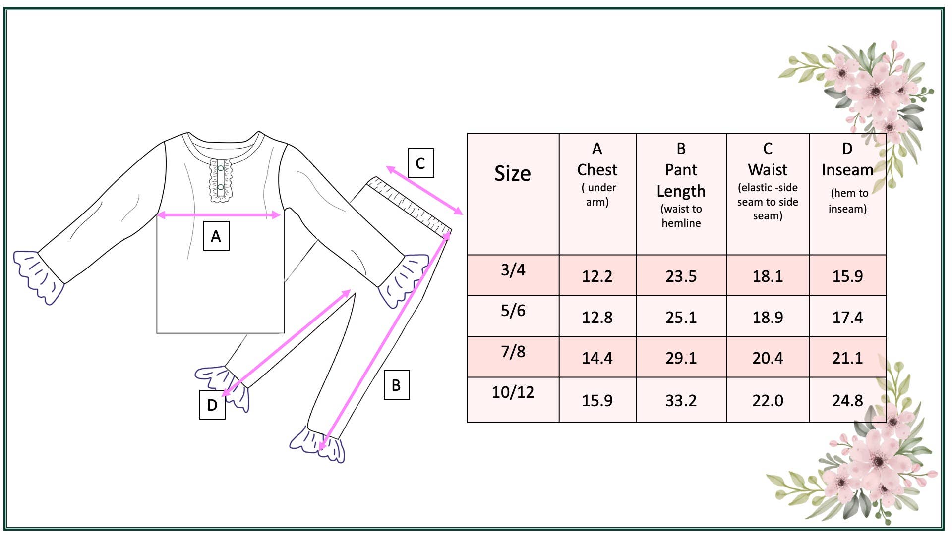 Girls two piece lounge play set includes green & pink nutcracker holiday tree print long sleeve top with matching pants. Buttons and ruffle details galore. SUPER SOFT FABRIC! Perfect everyday loungewear for cozy winter holidays.