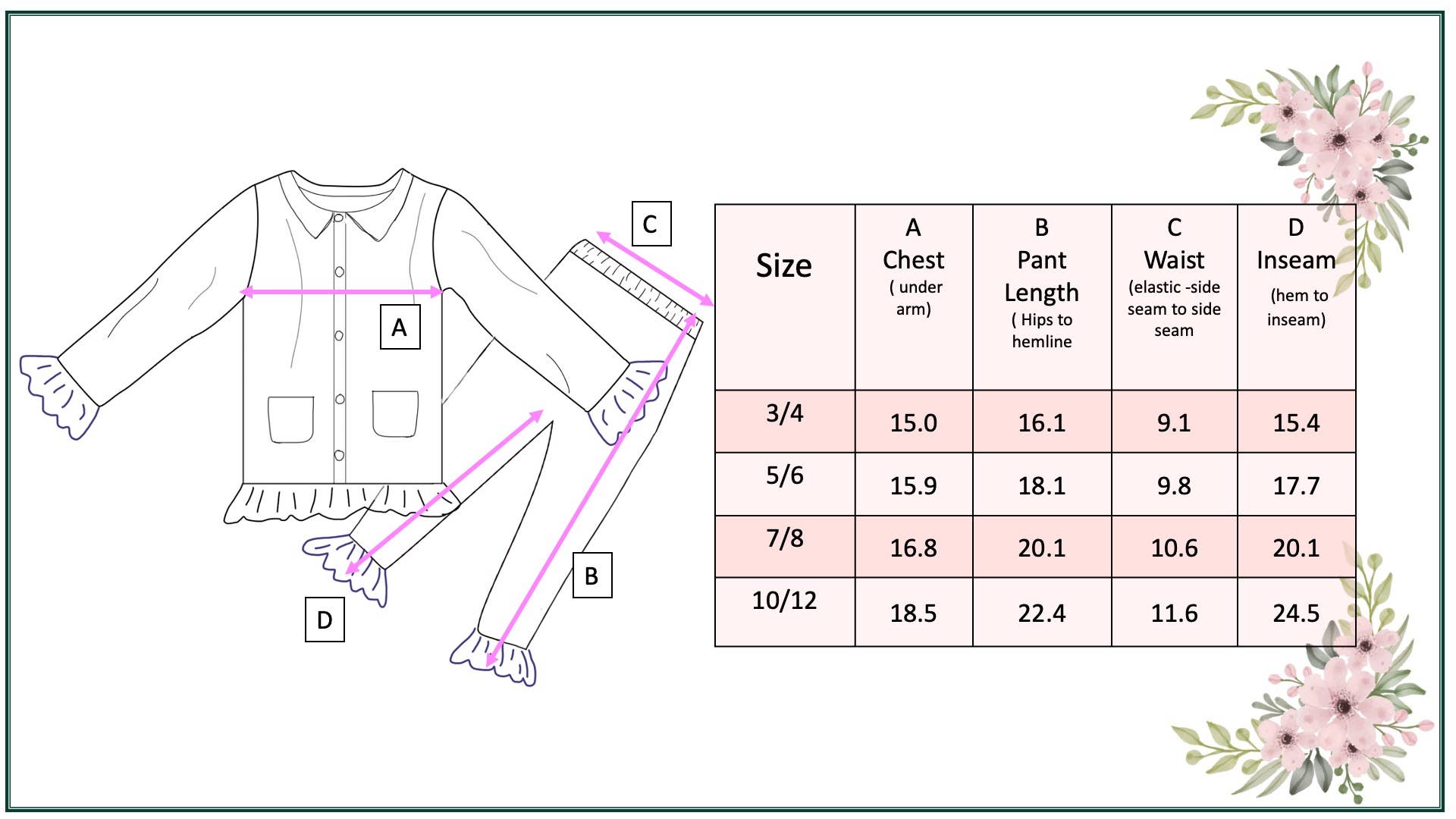 Girls two piece play set includes long ruffle sleeve red & sage Holly print button top with Embroidered Holly Berry Pockets and pants that have ruffle hems. Perfect loungewear for Fall & winter days and for holiday Christmas morning!